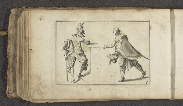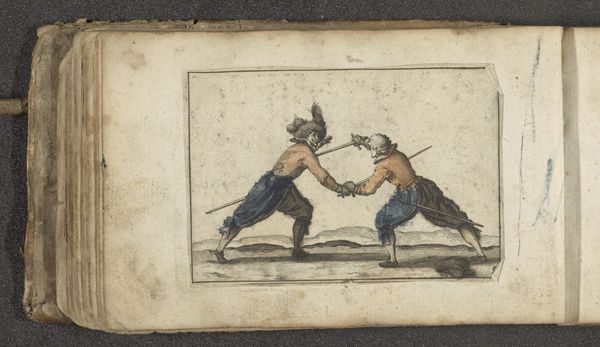 This engraving titled "Twee acteurs in gevecht" (Two Actors Fighting) was made in the early 17th century by Paul Göttich, using line engraving and etching, and then delicately hand-colored. The etching process would have begun with Göttich covering a copper plate with a waxy, acid-resistant ground, then using a sharp needle to scratch away lines, exposing the metal. Immersing the plate in acid would bite into these lines, creating the recessed areas that hold ink. The image we see here, of two figures dramatically posed mid-fight, would emerge through the physical labor involved in this process. Consider, too, the social context: prints like this made art more accessible, turning images into a commodity, part of the burgeoning marketplace of early modern Europe. The controlled lines of the print contrast with the spontaneity of theater, suggesting how even performance could be captured, packaged, and sold. Seeing this, one realizes that the value of any artwork isn't just in its aesthetic appeal but in understanding how labor, materials, and historical context intertwine.