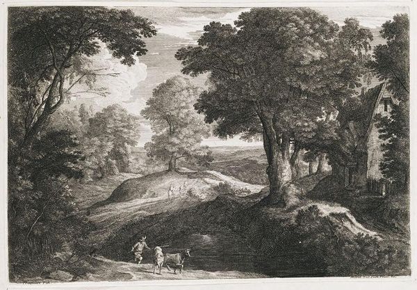Curator: The interplay of light and shadow really catches my eye here, setting an almost dreamlike tone. What do you see, Editor? Editor: A landscape where serenity meets the sacred. This canvas, called “The Rest on the Flight into Egypt,” likely created sometime between 1627 and 1666, invites contemplation, but the specific painter remains a mystery to us. Curator: "Rest on the Flight to Egypt" is a well-worn theme, popular with patrons for their domestic chapels. But, interestingly, the anonymity surrounding the creation almost democratizes it; we're left to engage without the weight of a known master. It’s currently held at the SMK, the Statens Museum for Kunst. Editor: Exactly. Look at how the artist bathes the Virgin and Child in that otherworldly glow, tucked under the protective arm of the massive tree. The symbolism is immediate: safety, refuge, the nurturing power of nature, shielding innocence. It's an ancient idea. Curator: Yes, and the context here—the Counter-Reformation’s emphasis on relatable, human portrayals of biblical figures—definitely shaped the visual vocabulary. The holy family becomes less remote, almost pastoral, reflecting the Church's efforts to connect with the everyday lives of the faithful. Editor: And see how that bright halo effect almost dissolves into the surrounding landscape? It feels deliberately integrated, emphasizing the divine presence interwoven with the natural world. It also diminishes some of the classical divine authority. I wonder if the piece originally served as part of a series, or held some kind of narrative clue now missing from the singular piece. Curator: That could well be. Its place within larger devotional practices tells us so much. Even now it holds a power, offering us a moment of reflective calm within a museum space, connecting us to centuries of artistic and religious traditions. Editor: Ultimately, beyond the art-historical context, I find its enduring appeal lies in that universal longing for peace, for protection of the vulnerable—ideals rendered so beautifully here through light, symbol, and the promise of respite.