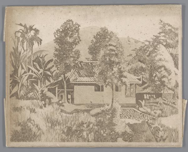 Editor: So, this etching is called "Huizen in de kampong met de vulkanen Salak en Gedeh op de achtergrond, Buitenzorg" by Willem Witsen, circa 1921. It's a landscape view, and I’m really drawn to the texture created by the etching. What stands out to you? Curator: I see an etching made through a very specific and material process of production: Witsen painstakingly manipulates metal and acid. Notice how that process records a very particular landscape and a social scene – the houses in the kampong. He's not just depicting a beautiful view; he's etching a scene of labor and living. Think about who built these houses, who lived there, and what their relationship was to the volcanoes in the background. The act of etching, usually considered a refined art form, captures vernacular architecture, raising questions about class and cultural exchange. How does this complicate our understanding of "high art"? Editor: That's a really interesting perspective! I was just appreciating the aesthetic, but now I see the contrast between the technique and the subject matter. So, you’re suggesting that Witsen’s choice of subject elevates everyday life to something worthy of artistic consideration? Curator: Precisely. Furthermore, think about the networks required to create this image: from the mining of the metals for the plate, to the making of the acid for the bite. The whole materiality indexes flows of global capital, connecting sites of extraction, production, and consumption. Does knowing this influence your viewing experience? Editor: Absolutely. It’s shifted my understanding completely. It makes me consider who this image was for, and how the consumption of the artwork ties back to these global processes. Curator: Right. It reframes what appears as just a pastoral landscape as embedded in broader material and economic relationships. Editor: Thanks, I never would have considered all that by just looking at it. Curator: The work really reveals a whole hidden dimension once we think of its making.