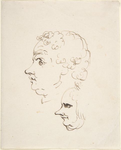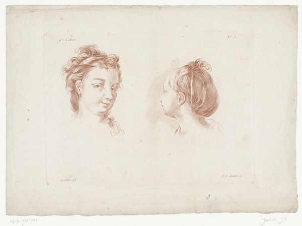 This image shows two women's heads, created by Jean François Janinet around the late 18th century using etching and possibly aquatint. Janinet was a master of color printmaking, and here, we see the delicate lines achieved through etching, which are enhanced by the subtle tonal variations that were created through successive washes of color. The process of etching, where the design is bitten into a metal plate with acid, allowed for multiple impressions to be made, a crucial aspect of printmaking's role in disseminating images and ideas. It speaks to the rise of a print culture and the democratization of art in the 18th century. It's worth considering the labor involved in creating these prints. From the engravers, to the printers, and distributors. Looking at this image we gain insight into the cultural and economic context of its creation and consumption, and perhaps even begin to challenge our traditional understanding of Janinet's work as 'fine art.'