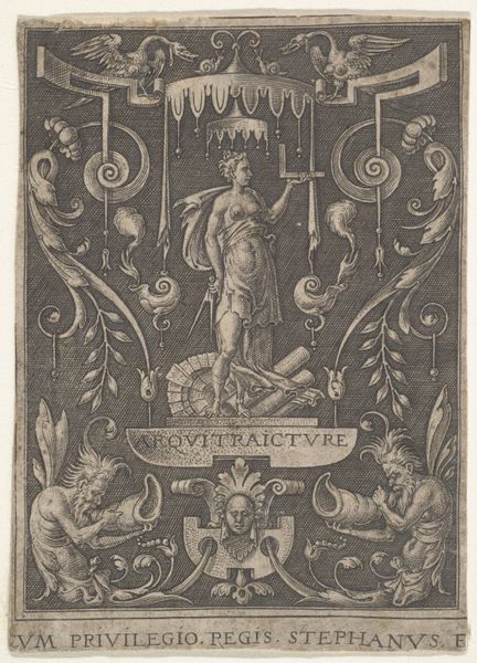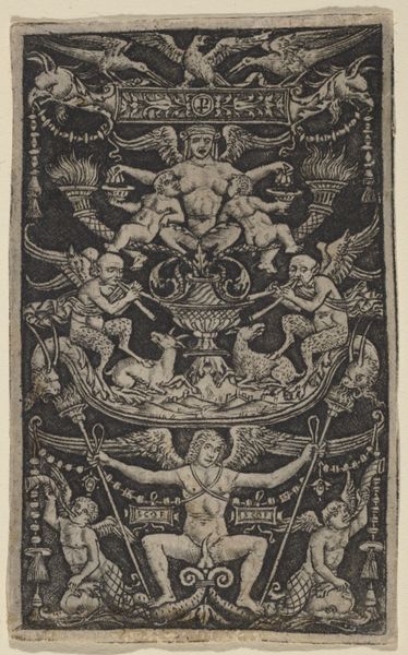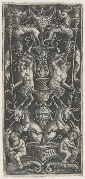 Curator: Oh my, what a wild little universe crammed into a panel. My first thought is... intense! It’s so dense, so meticulously detailed. I feel like I’m peering into some strange alchemical experiment. Editor: Indeed. We’re looking at “Panel with a Candelabrum Containing a Female Satyr Seated on a Helmet” by Heinrich Aldegrever, created in 1549. Aldegrever was a German engraver and printmaker, working in the Northern Renaissance style, a period marked by detailed naturalism, and a renewed interest in classical themes. This is a particularly fascinating example of ornament print. Curator: Ornament print? It sounds very... functional? But this piece feels like pure fantasy. Those figures, draped in swaths of fabric, surrounded by birds, fruit... and that satyr! It’s all so theatrical. It's less ornament and more a bizarre stage setting. Editor: In the 16th century, these prints functioned as models. Architects, artisans, goldsmiths consulted them for inspiration in their designs, for interior decor and luxury items. Prints like this helped to disseminate artistic ideas across Europe, but you are right about that “fantastical” element. Consider how the female satyr at the bottom serves as a support, literally shouldering symbolic burdens like the helmet. There is something inherently political in representing allegorical themes for contemporary events in ornamental compositions. Curator: Ah, so it's supposed to inspire artisans… I still can’t get over the sheer oddness. This piece feels so much stranger, wilder than I would expect a model for design to be. Editor: Well, I imagine that depended on the patron commissioning it, and where. Keep in mind that Germany during the Reformation saw the rise of Protestantism and a departure from the religious iconography of Catholic lands. Aldegrever joined the Anabaptist movement, and was very familiar with new socio-political paradigms. This, no doubt, influenced his designs. But still, to us it may appear bizarre to find this riotous visual landscape intended for more practical purposes. Curator: Riotous, yes! It’s as if a fever dream manifested as a highly polished, incredibly precise engraving. And knowing it’s rooted in this time of upheaval… it suddenly makes even more sense. There’s a push and pull here, a tension that's just mesmerizing. Editor: Agreed. And with a closer look, you begin to unravel so many narratives… Curator: A testament to how art always reflects its chaotic times. I may even try making my own design. Wish me luck.