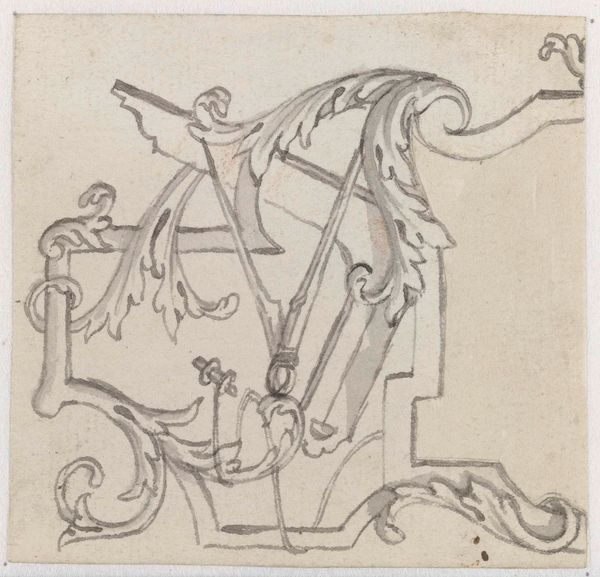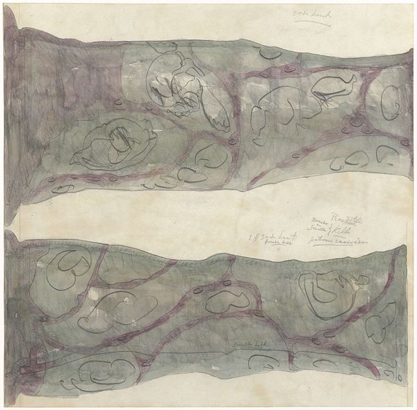 Editor: This is "Ontwerp voor aardewerkdecoratie van schotel Wandeling en Eenvoud," or "Design for ceramic decoration of dish Wandering and Simplicity," possibly created between 1917 and 1918 by Theo Colenbrander. It appears to be a mixed-media drawing with ink, watercolor, and pencil on paper. It strikes me as an odd juxtaposition of precise geometric shapes and seemingly random scribbles. What’s your interpretation of the composition? Curator: The dish design presents a fascinating study in contrasts. Note the duality of form, bifurcated by a vertical axis. One side reveals precise linework—geometric abstractions in gentle hues; the other a seeming chaos of free-flowing script and suggestive figures. Are you struck by any tension between these halves? Editor: Absolutely. The one side with figures feels almost like a narrative, while the other is purely abstract. But is there a link between these very different visual elements? Curator: Consider how the curvature implied by the circular format binds these disparate elements. The figures, however diminutive, establish a grounding within the boundless abstraction. Furthermore, note the interplay of line – delicate pencil against decisive ink. How might we understand this negotiation of control and spontaneity? Editor: Perhaps the contrast suggests different aspects of “Wandering and Simplicity,” with figuration offering a sense of narrative while the other uses colour as a free, emotive, exploration? I hadn't considered the active interplay between those visual languages. Curator: Precisely. It demonstrates how the most compelling artworks engage the viewer in decoding the relation between disparate elements, sparking introspection and deeper questioning about formal qualities and expressive capabilities. Editor: I see the connection more clearly now. This dialogue highlights the artist's process. Thanks for breaking it down for me.