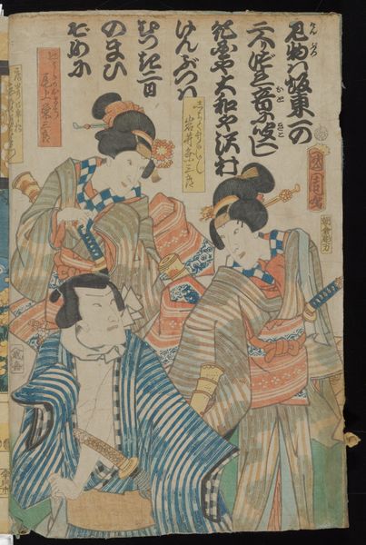 Curator: Allow me to introduce "Actors Ichimura Uzaemon XIII as Inuta Kobungo Yasuyori (R) and Ichikawa Kodanji IV as Inukawa Shosuke Yoshito (L)", a striking woodblock print by Utagawa Kunisada, created around 1850. Editor: My initial impression? Dynamic tension! The contrasting colours—that brilliant, patterned purple against the more muted blues and blacks—really energises the composition. Curator: Absolutely. Kunisada was a leading designer of ukiyo-e prints, and here, we see a double portrait of Kabuki actors, figures who were incredibly popular in the Edo period. Their portrayal highlights not only their celebrity but also the cultural importance of theatre. Editor: I’m immediately drawn to the shapes; the way Kunisada employs line and flattened perspective really pushes the figures forward. And those repeating geometric patterns in the background give it an almost abstract feel. What can you tell us about these characters they're portraying? Curator: These actors depict characters from the popular epic novel *Nanso Satomi Hakkenden*, a sprawling narrative of samurai virtues. The prints like this functioned almost like publicity for theatrical performances. Consider how vital printed ephemera was to fostering interest. Editor: Look at the texture in their robes! It looks almost collaged but its carefully printed. The colour intensity also speaks volumes—almost a symbolic language of its own. Curator: Exactly, and those textual blocks and patterns aren't merely decorative but bear cultural significance too, revealing an understanding of contemporary trends. Each element adds another layer of meaning for contemporary audiences. Editor: Do you think it’s making some subtle commentary through formal means here? I keep thinking about this strange balance that somehow maintains itself. Curator: The actors themselves embody these complex performances. Each theatrical gesture performed on stage became almost like a cultural shorthand— gestures within and beyond theatre intersect in those Kabuki traditions! The success relies, in many respects, on historical circumstances, which were rapidly shifting when Kunisada was producing this work. Editor: Knowing a bit more, I really admire Kunisada’s confident approach in fusing visual spectacle, story, and something profound of what Kabuki might've meant in that time. Curator: Absolutely. This print opens a window into understanding Japanese cultural life during a dynamic period and its connection to artistic forms like printmaking.