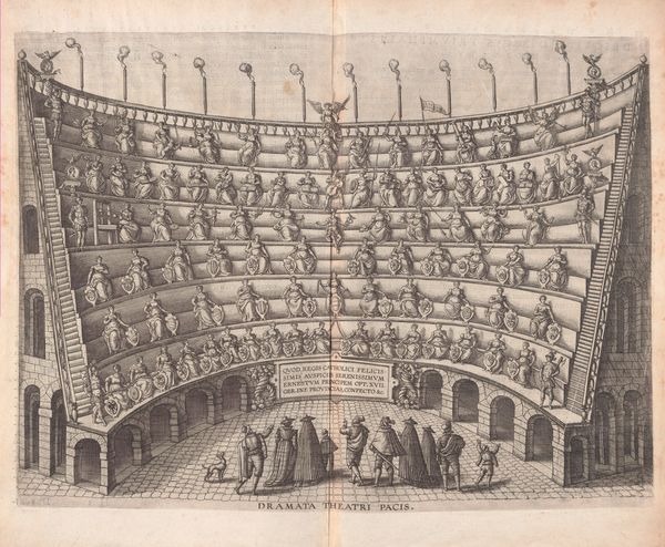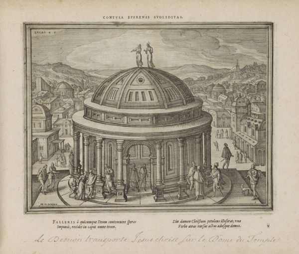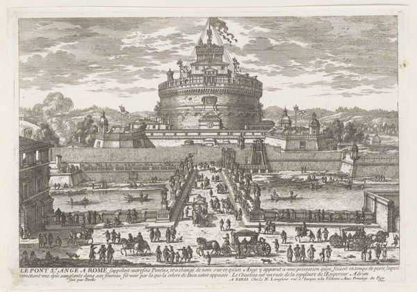 Curator: We're looking at an engraving, an architectural print, titled *Speculum Romanae Magnificentiae: The Sepulchre of Hadrian*, dating from 1583. Editor: It's strikingly geometric. The layered cylinders create a sense of imposing stability, but I find the figures along the top strangely lifeless, like chess pieces on a tiered board. Curator: That rigid formality stems from its function as a plate in a series documenting the splendors of ancient Rome. Prints like these played a vital role in shaping architectural knowledge and ideals during the Renaissance. Editor: So, less about artistic expression and more about disseminating information? Still, there's an undeniable power dynamic embedded here. The tomb of Hadrian, a symbol of imperial authority, being meticulously reproduced and circulated. Curator: Exactly. Consider how the act of documenting and disseminating these images further reinforced the legacy of Roman power. It became a way for Renaissance elites to connect themselves to the perceived grandeur of the past. Editor: The architecture is imposing, almost brutally so, which speaks to the inherent violence that is required to uphold such historical ideas of grandeur. Did the symbolic role that the tomb served transform over the centuries? Curator: Certainly. Its later use as Castel Sant’Angelo is a key aspect. It evolved from a mausoleum to a papal fortress, signifying the Church's ascendance over secular Roman authority. Editor: Transforming a place of death into a stronghold—it reflects how institutions absorb and repurpose symbols of power. It gives you a glimpse into what societies value and what they seek to suppress. Thank you. Curator: An insightful perspective. These prints served as powerful tools for shaping and communicating power through architectural ideals.