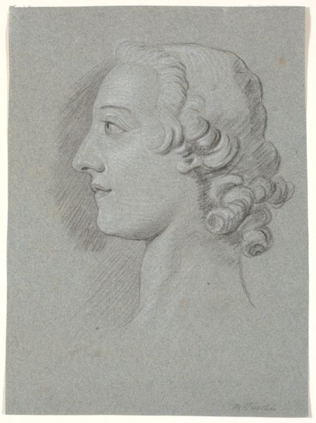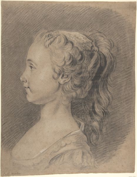 Editor: So, here we have Louis Marin Bonnet’s “Head of a Young Girl in Profile,” made sometime between 1705 and 1793. It’s an engraving, currently hanging at the Met. It feels...delicate, almost like a fleeting memory. What whispers to you when you look at this print? Curator: Whispers, precisely! I'm immediately drawn to the ephemeral nature, amplified by the medium itself. Engraving, you see, can capture such intricate detail, almost like bottling a dream. And consider the context, the Rococo period. This wasn't just portraiture, it was capturing essence, a fleeting moment of grace, the fashionable ideal. Does her expression evoke any specific feeling for you? Editor: Definitely innocence, maybe even a hint of melancholy. It's in the downturn of her lips, and the way the light catches her eye. Curator: Ah, the play of light! Notice how Bonnet masterfully uses it to sculpt her face, almost as if she's emerging from a hazy dreamscape. And that hairstyle! Those curls seem to defy gravity, a statement of aristocratic leisure. It's a world away from our hurried selfies, wouldn't you agree? Editor: Absolutely! It’s carefully posed and presented, every detail contributing to a desired image. Almost manufactured, I suppose? Curator: Manufactured...perhaps, though I might say "carefully curated" feels more apt, don't you think? What a captivating glimpse into the past, this “Head of a Young Girl”. I learned something today. Editor: I agree, the word choice definitely impacts our perception! I’ll consider this framing in my next visit to the museum, for sure!