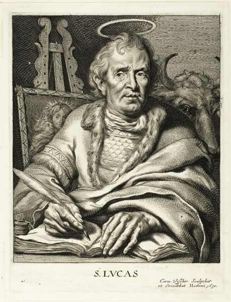 Editor: So this is Cornelis Visscher's "Saint Luke," a drawing from around 1650, rendered in pen, ink, graphite and charcoal on paper. The detail is pretty amazing for such a small work. I am struck by the rather direct gaze. How do you read this image? Curator: I see a portrait steeped in the visual language of its time, yes, but also a potent statement about the act of creation itself. This isn't just St. Luke; it's a representation of authorship, shaped by prevailing religious and social doctrines. Consider the ox behind him—the symbol of St. Luke—reduced to a supporting role while the *man* takes center stage. Editor: That’s an interesting point. So it’s about authorship as a power dynamic? Curator: Precisely. The halo, the book, the instruments of writing, all serve to legitimize and elevate St. Luke’s role, but let's not forget the layers of interpretation that have been imposed upon this image throughout history. How might a feminist reading of this work challenge the singular authority it portrays? Editor: Perhaps by questioning the traditional male-dominated narrative of artistic and religious creation, right? Curator: Exactly! The very idea of a divinely inspired "author" needs to be unpacked. Visscher's Saint Luke offers a lens through which to examine not just art history, but the construction of knowledge and power itself. This Saint Luke raises complex questions regarding gendered creative labor, class structures, and their entanglements within religious narratives of early modernity. What was not apparent at first viewing suddenly presents critical discourses when approaching art history through interdisciplinary analysis. Editor: This makes me see the artwork through an entirely new context. Thanks. Curator: My pleasure. These dialogues between past and present are crucial to our understanding.