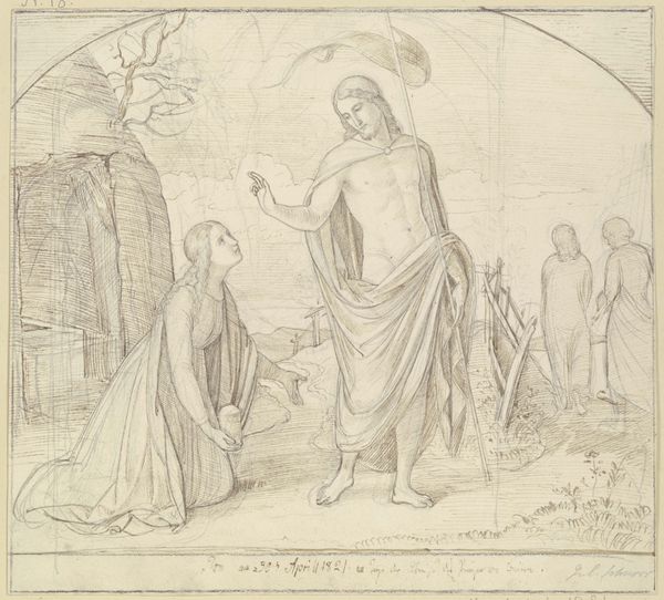 This drawing, ‘Allegory of the Genius of Art,’ was made by Ditlev Blunck in the 19th century, using graphite on paper. The visible labor involved in the artwork's production is considerable, seen in the meticulous crosshatching and precise lines that define the figures and the landscape. Graphite, as a medium, allows for a high degree of control and detail, reflecting the academic training and artistic skill of the time. The monochrome palette, dictated by the material, places emphasis on form and light, typical of neoclassical aesthetics. The artist’s method transforms a humble material into a powerful expression of artistic ideals. Appreciating the skill involved in the process encourages us to look beyond the artwork, recognizing the cultural values and traditions that have shaped its making. This approach challenges traditional distinctions between fine art and craft, valuing the work and social context embedded in its creation.