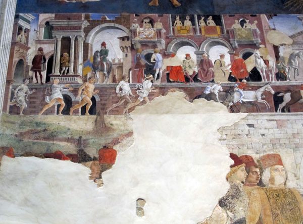 Domenico Beccafumi made this artwork in the 16th century using sgraffito. This technique involves applying layers of plaster tinted in different colours to a surface, then scratching or incising the upper layers to reveal the colours beneath. Sgraffito offers a fascinating connection between the artwork and the labor that went into its making. It demands meticulous preparation and skilled execution. Each line and shade is the result of careful carving, a process far removed from the spontaneous brushstrokes of painting. Here, the sepia-toned surface has been intricately carved, each line precisely articulated. The soft modeling of the figures, the textures of the landscape, and the dramatic tension of the biblical scene are all achieved through the controlled removal of material. Beccafumi has elevated a humble technique to monumental scale, bridging the gap between craft and fine art. So, as you look at this piece, consider the physical effort, the planning, and the sheer mastery required to bring it to life.