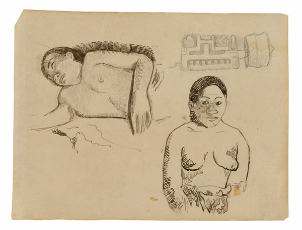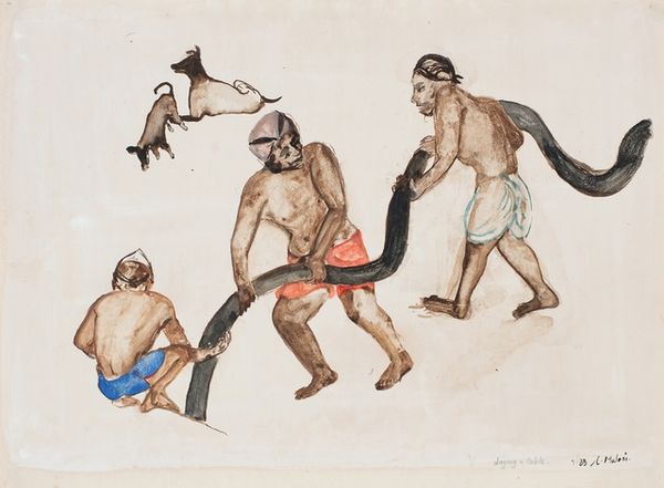 Curator: Before us is "Men of the Banda Tribe" by Alexandre Jacovleff. Executed with charcoal and pencil, the piece showcases four figures in varying poses and degrees of finish. Editor: The immediate impression is one of weariness, wouldn’t you agree? There is an emotional weight carried by the somber expressions of each subject and the monochromatic medium. I'm compelled to reflect on themes of colonialism. Curator: While the subjects exude emotion, I'm more interested in the technique. Jacovleff's application of line and shading defines musculature and bone structure and expertly utilizes hatching to create tonal variation, conveying spatial depth. Editor: But these aren't just lines and tones in isolation, are they? These stylistic choices inevitably invoke post-colonial dialogue. The European gaze inherent in Jacovleff's anthropological rendering prompts important questions about representation and power dynamics. Curator: You're quite right that we can not consider art divorced from power. However, look closely at how the artist manages to individuate the faces with the slightest variation of detail to each unique human, making them discernible. Editor: These faces evoke historical and contemporary resonances. They beckon a critical discussion on the West's ongoing cultural appropriations of, and misrepresentations of, the global South and the complexities surrounding anthropological portraiture. How do you contend with that tension? Curator: Well, while that reading holds validity, one could also choose to focus on the pure technical mastery apparent in the application of the charcoal, giving body to light. Editor: I suppose the brilliance of the artwork can stand that multiplicity. I find myself leaving with far more questions about who has the privilege to record such images and in what context are such representations circulated. Curator: An interesting challenge, indeed. Ultimately, I'm drawn back to Jacovleff’s understanding of human form.