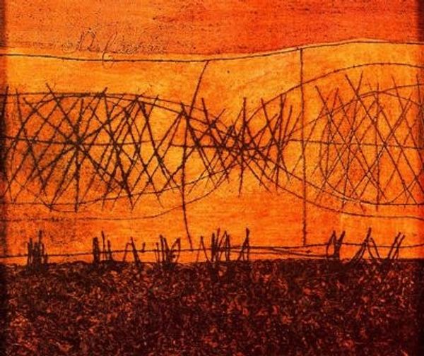 Curator: This is "Linneus escriba" created in 1948 by Modest Cuixart, a piece rendered in mixed media that epitomizes his exploration of abstract art. Editor: It's immediately striking— a complex web of lines overlaid on a background of muted yellows and browns. There's a certain anxiety in its abstraction. It feels almost frantic. Curator: The late 1940s were a pivotal moment. Spain was still reeling from the Civil War and its aftermath. Artists like Cuixart were grappling with how to express a world fundamentally fractured, how could one create after what was, was no longer, you see? Editor: Indeed. And from a formal perspective, look at how those sharp lines cut across the warmer tones beneath. It disrupts any sense of tranquility the colors might offer. There is that element of "angst." Curator: Cuixart's embrace of abstract expressionism allowed him to engage with universal feelings of distress and hope during the Franco regime. It's a way to sidestep censorship by not depicting easily defined iconography. This artwork speaks more of the atmosphere felt at the time. Editor: Note, too, how some of those lines appear to almost scrape at the surface of the canvas, enhancing a raw texture. Curator: Yes, the materiality is key here. The way the paint is applied, almost violently at certain places, it heightens the sense of a world under tension. Cuixart went on, with others, to create the Dau al Set group and in a time where "official" art was celebrated for its conservative realism, Cuixart was committed to push boundaries through non-figurative art. Editor: I appreciate your insights; the sociopolitical climate gives the formal decisions a different weight. Now, I'm struck anew by the interplay between order and chaos inherent in this piece, especially with the composition; the eye doesn't know where to focus. Curator: Right, in this sense Cuixart has presented us not just a picture, but with a perspective: a period where clarity, focus, or direction was not afforded to everyone. Editor: Seeing the piece through this new lens changes how I think about its emotive power, beyond just aesthetic pleasure. Curator: Art like this invites us to ask difficult questions about the artist, his context and our present experience of it all. Editor: Well said. It shows, even through abstraction, that artworks like "Linneus escriba" give shape to human experiences.
