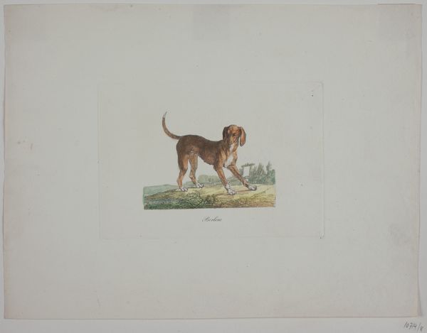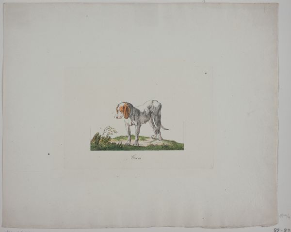 Christian David Gebauer made this print of a dog, titled Kellwuth, using etching and engraving techniques. These processes involve working lines into a metal plate, inking it, and then using a press to transfer the image to paper. Here, we can observe the crisp lines and delicate shading achieved through these methods. The material qualities of the print—its flatness, the texture of the paper, the precision of the lines—speak to the artist’s mastery and the careful labor involved. Printmaking, traditionally seen as craft rather than high art, played a crucial role in disseminating images and ideas, influencing tastes and perceptions of the world, including the natural world. Consider how this print, with its depiction of a hunting dog, might reflect societal values and class distinctions of the time. Was it intended for scientific study, or simply as an aesthetic object? The making of art objects like this one is deeply embedded in the cultural and economic conditions of its time.