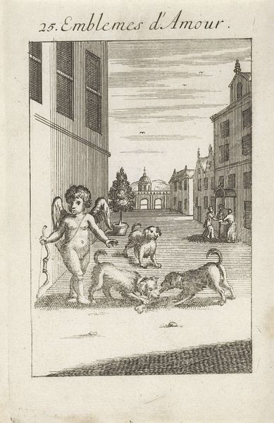 Editor: This engraving, "Geblinddoekte Amor" by Jan van Vianen, dated 1686, has an odd yet formal feel to it. The lines are very precise, and I’m drawn to the way the cityscape in the background sort of dwarfs the figures. What stands out to you about this piece? Curator: It's an excellent observation about the cityscape. As a materialist, I see this engraving as deeply rooted in the socio-economic context of its creation. The very process of engraving, requiring specialized tools and skilled labor, points to the rise of a merchant class able to afford such refined, detailed work. Consider how the *act* of replicating images, through printmaking, democratizes access, yet the initial creation and distribution remain controlled. Editor: So, the medium itself speaks to class and access? Curator: Precisely. And the allegory—blinded Cupid— functions within this system. It's not simply about 'love is blind,' but consider who this message is for and how it reflects their values. Who commissions or buys an image about love? What type of consumer behavior are we really talking about? Editor: Interesting. It's easy to get caught up in the image itself without thinking about who made it, how, and for whom. Curator: The deliberate choices made by the artist and the societal structures that allowed for the image to exist are crucial. The labor involved, the materials used, even the way it would have been distributed – all inform our understanding of its meaning and value within that specific time. Thinking about the social context encourages a critical analysis. Editor: I hadn't considered the engraving process as part of the artwork's message before. It completely changes my perspective. Curator: Indeed. Material analysis bridges art and social history, transforming the artwork into a site of economic, technological and social exchanges. Editor: Thanks, I’ll definitely remember that in the future.
