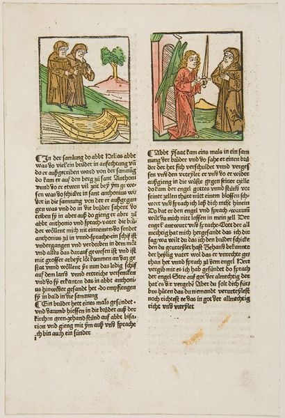 Editor: This appears to be an early print, "Presentation of Christ; verso: Flight into Egypt," by an anonymous artist. It's mostly black ink on paper, with some red accents. The figures are quite stylized. What do you see in this piece that speaks to its time and artistic intention? Curator: As a materialist, I'm drawn to the production itself. The woodcut process—the labor involved in carving the block, the printing, and the distribution—speaks volumes about the accessibility of religious imagery at the time. Consider the paper, the ink, and how they were sourced, traded. Editor: So, more about the making than the meaning? Curator: The two are intertwined. The relatively simple technique allowed for mass production. It allowed the creation of devotional images, suggesting a growing demand for personal religious artifacts. The very materiality shapes its purpose. Editor: That’s a perspective I hadn’t considered. Thanks. Curator: And thank you; your observations are also quite insightful.