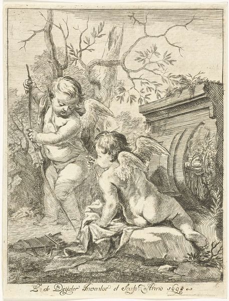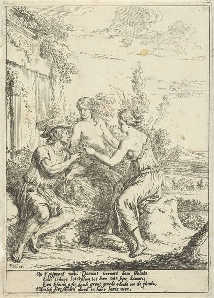 Curator: Here we have an etching by Gerard Hoet, likely created between 1658 and 1733, titled “Paris en Oenone.” It resides in the collection of the Rijksmuseum. My first thought looking at this? Editor: It’s oddly serene, isn't it? Considering the drama those two are usually involved in. I get a feeling of reluctant farewell, like a beautifully etched goodbye. Curator: That captures it nicely. Hoet depicts a moment from classical mythology: Paris’s departure from the nymph Oenone, before his fateful encounter with Helen. Editor: There’s a tangible sadness about Oenone’s posture, almost pleading. Even their clasped hands seem more of a bond being stretched than a loving embrace. It's heavy. Is that supposed to be a dog there too at the base of the figure? It seems so odd there Curator: The dog could symbolize loyalty and fidelity in this story of lovers' farewell. Beyond the pathos, observe the linear style; Hoet uses carefully placed lines to create form and depth. It really anchors the emotional narrative. Editor: The detail is stunning, but somewhat detached—almost scientific. Does this style evoke Baroque landscape art as something about the scene feels less free than I would like it. Curator: Indeed. While this landscape bears similarities to depictions in the Baroque Era, such as those of the Italian countryside and light of Rome in the art, Hoet is taking those elements of Italian painting back with him and turning it into something of his own. And the scene itself, derived from classical literature, is timeless, it evokes universal themes of love, duty, and destiny. Editor: Funny how these old stories get recycled. Even though I know what happens next, I find myself hoping Paris would just stay put! Curator: The myth is part of our collective unconscious. These images solidify the stories' legacy and enable reflection. Editor: True, and maybe that’s why even a tiny etching like this can still punch you in the gut after all these years. Curator: The symbolic endurance of these narratives certainly transcends both medium and era.