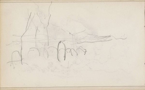 Editor: This is George Hendrik Breitner’s "Landschap, mogelijk met bebouwing" or "Landscape, possibly with buildings," a pencil drawing on paper created sometime between 1872 and 1879. It’s incredibly delicate; almost ephemeral. What historical context informs your interpretation of this sketch? Curator: This unassuming sketch offers a glimpse into the development of Breitner’s Realist vision. While Impressionism is noted, it’s his move toward Realism and depicting everyday urban life for which he is most known. Pencil sketches like these served as crucial preliminary studies. Consider how the accessibility of materials like pencil and paper democratized art-making. Editor: Democratized art-making? In what way? Curator: Relatively inexpensive drawing materials allowed artists to quickly capture fleeting moments and scenes from daily life without the constraints of more formal artistic processes favored by the academy. Think about how the rise of industrialization fueled both urban expansion and a burgeoning middle class with its own set of cultural values. Breitner wasn't painting heroic allegories but the world around him. The muted tones might seem… quiet? Editor: Yes, very quiet. Almost melancholy. Was that a conscious choice, or a reflection of the era? Curator: It reflects a shift in artistic sensibility. The focus moved to the immediacy of observation. The seemingly unfinished quality reflects the speed of modern life and perhaps a challenge to the expectations of the established art world. Were artistic institutions ready to embrace these sketches as works of art in their own right? Editor: So, it’s not *just* a landscape, but a statement about the role of art itself? Curator: Precisely! It speaks to a changing understanding of art’s purpose. Editor: I never would have thought a simple sketch could hold so much complexity. I’ll definitely look at these preparatory works with a fresh perspective going forward. Curator: Exactly, these glimpses behind the curtain allow us a much deeper understanding of what informs finished works of art, as well as a sense of how the very definition of "art" was evolving.