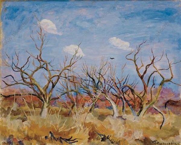 Curator: Oh, wow, a real silence. I'm hit by the barrenness. Gives me the shivers. Like all the color has been sucked out of it. Editor: Allow me to introduce Sidney Nolan’s, "Desert Storm" rendered in tempera on board, from 1955. It resides here at the Tate Modern in London. Curator: Desert Storm feels so...un-Australian to me! Nolan's landscapes usually crackle with that raw, red earth energy. This... this is bleak. You can practically feel the heat evaporating. It is just a beautiful whisper of a memory. Editor: Indeed. Note the pronounced horizontality—how the composition is ruled by these stark lines. The layering creates a very tangible spatial recession; horizon acting as a grounding force. Also, Nolan's execution demonstrates expressionist applications... Observe. Curator: Totally. It is like Nolan used broad strokes to create an atmospheric haze. This adds to the dreamlike quality. What those dry branches that seem to claw at the sky? They are gorgeous and unsettling. Editor: The branches offer a strong figuration to the scene... the contrast between these dark, almost charcoal-like forms and the diluted ground and aerial space invites visual discourse to their materiality and symbolic relevance. Curator: Exactly! Nolan's playing with that tension between absence and a potential for renewal; desert blooming or dying is like some sort of internal struggle… you wonder what that looks like from a cultural standpoint... Editor: An astute observation. What this work contributes is, notably, the articulation of absence—the formal means, of which are, after all, intrinsic to the subject. Curator: Yeah, seeing this is a kick to the guts. Still a banger. Gives me the melancholies but those little jolts of life sticking out there help remind me. Editor: The "Desert Storm’s" composition and handling are undeniably stark... and affecting. Its articulation of absence echoes in the mind long after viewing.