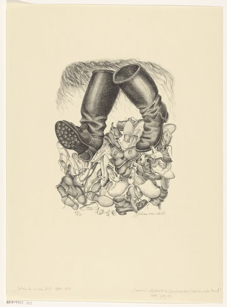 Leon Kosmulski’s "Vleugel," created in 1948, is a woodcut print, a medium with a rich history tied to the democratization of art. The stark contrast of black ink on paper speaks to the labor-intensive process of carving the image into a wood block. This process gives the print a unique visual language, lines carrying a certain tension. Look closely and you will notice that the parallel lines create a strong contrast between light and shadow. The design features a surreal scene with a grand piano, emerging from turbulent waves. Woodcut, unlike painting, allows for multiples, making art more accessible beyond elite circles. The artist's choice of this medium suggests a connection to the wider social and political context of post-war Europe, where the drive for cultural rebuilding went hand in hand with progressive ideals of inclusivity. So, when you look at "Vleugel," consider not only the image but also the hands that carved it, the press that printed it, and the potential it held to reach beyond the confines of a traditional art world.
