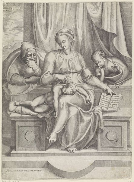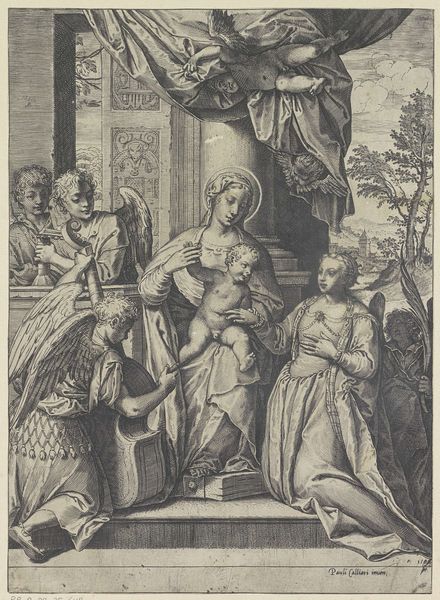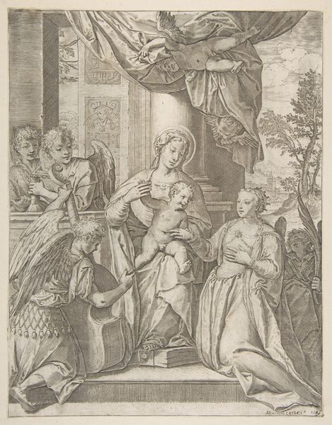 Editor: Here we have Girolamo Mocetto’s engraving, “Maria met kind zittend op een troon tussen Petrus en Johannes de Doper met musicerende engelen en drie vrouwelijke heiligen op de achtergrond,” created sometime between 1480 and 1531. It’s amazing how much detail he packed into a print. What stands out to you the most when you look at this artwork? Curator: The very process of its creation speaks volumes. Think of the labor involved in engraving that level of detail onto a plate, the physicality of the artistic act. What does it mean to take a traditionally painted subject and reproduce it via printmaking during the Renaissance? Editor: I suppose it allowed for wider distribution, making it more accessible to a larger audience, perhaps those who couldn't afford original paintings? Curator: Exactly! It disrupts the idea of the unique, precious artwork. Printmaking enabled mass production, making religious imagery—and the ideology it carries—a commodity. Consider the materials: the paper, the ink, the metal plate. Where did they come from? Who processed them? The answers reveal complex trade routes and social structures. And note that within the composition, you see several other technologies deployed to support religion and the state. Editor: I never really thought about prints in that light, focusing on the production itself instead of just the image. I guess I was only really considering the artistry. Curator: The artistry is inseparable from the means of its production. This piece prompts us to consider the Renaissance not just as a flowering of individual genius, but also as a complex network of labor, materials, and consumption. What kind of statements can be inferred by Mocetto displaying the materials he deployed so overtly in the end-result? Editor: That’s a totally different perspective. I am always so used to consider the composition but I will definitely think about that more from now on! Thanks!