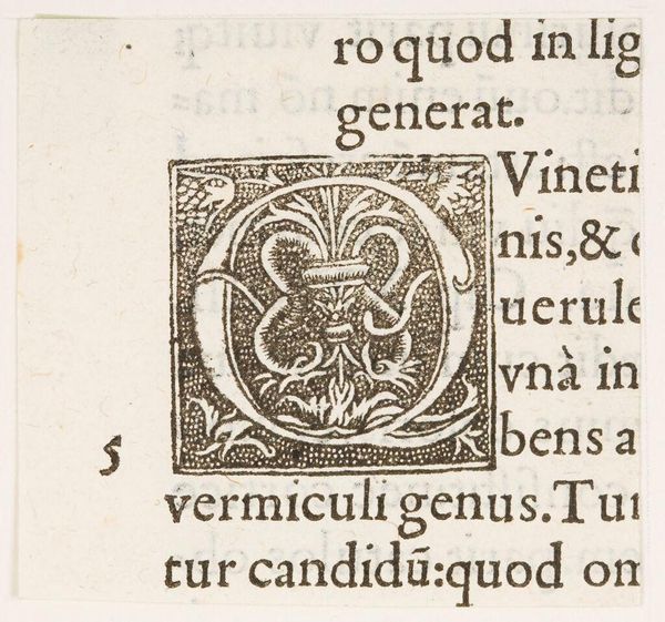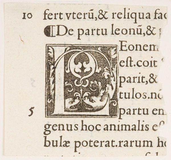 Editor: This intricate little print, titled "Initial D" by an anonymous artist, looks like it might be a page from a book. It's so detailed! What do you see in this piece? Curator: For me, it whispers of the Renaissance, where even the smallest detail was infused with artistic spirit. Imagine the artisan meticulously carving that block. It's not just a letter; it’s a miniature world, a testament to the beauty they found in language itself. A world sleeping, would you say? Editor: Sleeping? Interesting. I hadn't thought of it that way. Curator: "De somno animalia," it says. "About the sleep of animals." Isn't that lovely? Editor: Wow, I totally missed that. I will definitely look closer from now on!