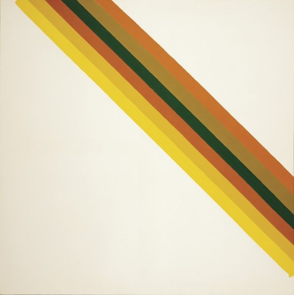 Curator: This is “K S I,” an acrylic on canvas painting by Morris Louis from 1959. It’s currently held at the Folkwang Museum in Essen. What are your initial thoughts? Editor: Well, it's undeniably striking. The stark whiteness, contrasted by those vibrant, cascading ribbons of color, it's as if rainbows are weeping onto the canvas. There's a somber quality mixed with undeniable energy. Curator: I appreciate your reading of that emotional tension. Formally, the "Unfurleds," as Louis termed this subset of his Color Field works, depend heavily on the sheer optical impact of color. The raw canvas isn't just a background; it’s an active element, structured around a kind of controlled pour. Editor: Controlled, perhaps, but the drips themselves evoke a sense of the uncontrolled, almost a letting go. The 'weeping rainbow' effect carries connotations of mourning, or perhaps a letting go of something cherished. There is a vulnerability, as if what has been meticulously crafted threatens to come undone. Curator: That friction is critical. Think of Louis’s engagement with Clement Greenberg's theories—pushing flatness, celebrating the unique qualities of paint on canvas. The canvas is stained, not painted in the traditional sense. This allows the colors to merge with the weave of the fabric. Editor: It creates a spectral quality. This stain technique, to me, is less about celebrating flatness and more about transcending the physical limitations of the canvas itself. It's almost spiritual; a yearning for something beyond the material. The convergence and near touching of the colours gives this abstract work an unexpected feeling of closure. Curator: Precisely. Though the imagery is purely non-representational, the interaction of these formal elements is still designed to stir emotion. There is a clear awareness of compositional balance in play, the symmetry achieved by opposing the streams, as well as the visual 'weight' or dominance asserted on both edges of the art work. Editor: And the choice to leave the center largely untouched pulls the eye in. You are initially drawn to the boundaries then are pushed inward towards that almost holy central light, suggesting transformation through chromatic catharsis. It’s more than just the visual qualities; it evokes a real sense of catharsis. Curator: An insightful reading, particularly in the way that you synthesise these formal and interpretive threads. I think you've shone light on the intrinsic emotional content embedded in Louis' technique. Editor: And you’ve clarified the revolutionary artistic ambition and structural strategy at the core of this work.