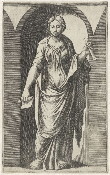 Curator: This is "St. Simon, from Christ and the Apostles," an engraving made by Lambert Suavius sometime between 1530 and 1576. It's currently held at the Metropolitan Museum of Art. Editor: What strikes me immediately is the intensity of the figure’s gaze and the rather odd contrapposto pose. It creates a certain tension, a kind of restless energy in an otherwise still image. Curator: Indeed. Note the virtuosity of the engraving technique, particularly in the drapery. The lines are used masterfully to suggest volume and texture. And if you look closely, the modeling of the face reveals an artist deeply invested in humanistic principles. Editor: I’m wondering about the choice to portray Saint Simon specifically. What did he represent to Suavius or to the audience of his time? The apostle with the saw suggests themes of martyrdom, resilience. How would a 16th-century audience have understood this image? Curator: Well, placing this image within its historical and religious context, we can understand it as part of the Counter-Reformation’s visual culture. Such images reinforced religious doctrine and offered exemplars of faith. But, if we just focus on the internal coherence, the distribution of light and dark, and the relationship between form and content... Editor: But to view it outside of its intention within its time is problematic, surely? Isn't it crucial to understand the context in which these engravings were created and circulated? The mannerist style suggests it could very well be linked to powerful patrons seeking validation or political messages of steadfast resolve in the face of religious and social change. Curator: Of course, the context matters but it's all there on the surface if you study it intensely. I suppose one could investigate the extent to which prints like this influenced popular piety or contributed to the evolving visual language of religious representation. But if you truly look with careful consideration you see this immediately without further need to interpret. Editor: Alright. Seeing this does highlight the vital role these engravings played in disseminating religious narratives. Curator: And I find it pleasing that this focus on visual analysis illuminates its internal elegance.