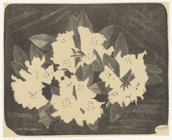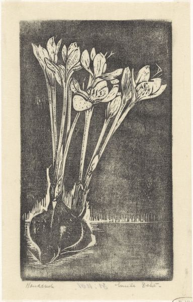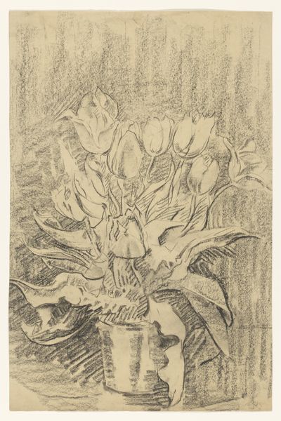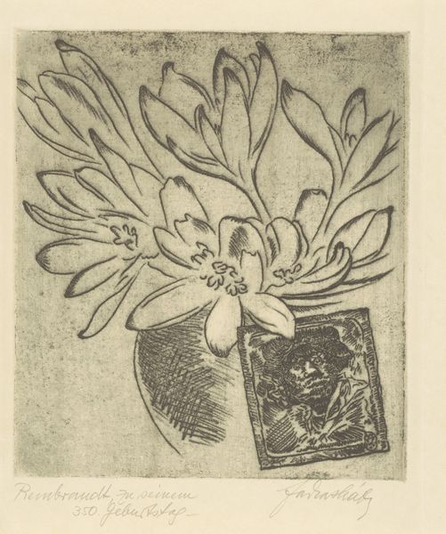 Curator: We’re looking at “Vaas met tulpen,” or “Vase with Tulips,” a print by Barbara Elisabeth van Houten. Its date is estimated between 1872 and 1950. The media used include etching and paper. Editor: It has a melancholy sort of beauty. The etching creates this lovely hazy texture, a little blurred around the edges. They seem like ghosts of tulips, really. Curator: Yes, that visual texture arises from the process itself, the controlled corrosion of the metal plate... We can see how line work and tone interact here, a hallmark of Van Houten’s commitment to the graphic arts. It's interesting how she merges the traditions of fine art and printmaking, inviting a reflection on art’s reproductive nature. Editor: It definitely leans into the print's potential for shadow and subtlety. There's a stark contrast between the very dark tulip on the left and those almost translucent blooms on the right. Like they're catching their last light. Curator: You’re responding to a key element: the use of chiaroscuro, the treatment of light and dark. Etching, as a replicable process, democratized image production and shifted how the 19th and early 20th-century Dutch consumed visual information. Prints brought art to a broader audience, influencing taste, and potentially, social discourse. Editor: Makes you think about who owned this, hung it on their wall. Maybe they loved gardens, maybe it reminded them of a loved one… it whispers of something lost, somehow. The texture alone speaks volumes; you can practically feel the rough quality of the paper beneath your fingers. Curator: Indeed. Van Houten worked in a period when etching underwent a significant revival. We can observe an increased interest in the craft and artistry. Prints allowed artists to explore detail and depth using methods different from those available through drawing or painting. Editor: What a journey for those humble tulips. Starting in a garden, then translated to metal, etched by acid, pressed onto paper, and now, centuries later, whispering secrets to us. Curator: A story etched in material. The etching is an index, pointing to layers of production and meaning. Editor: A little floral poem, penned in acid.