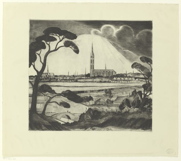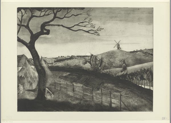Editor: So, this is Lodewijk Schelfhout’s “Haven van Bastia op Corsica,” made in 1924. It’s a print, giving it a somewhat stark, graphic quality. What strikes me most is how the scene feels both idyllic and strangely isolating. What do you see in it? Curator: The starkness you observe speaks to a critical tension: the romanticized view of Corsica versus the lived realities of its inhabitants. Schelfhout, as a Dutch artist, likely approached this landscape with a colonial gaze, seeking an ‘untouched’ paradise. Notice the figure on the donkey – does she seem integrated into the landscape or almost imposed upon it? Editor: I see what you mean. She's definitely separate. Like she’s passing through rather than belonging. The way she is dressed makes me think about how she relates to the environment. Curator: Precisely. Her dark clothing creates a silhouette that sets her apart, hinting at potential socio-economic disparities. Consider the time this piece was created – the 1920s were a period of burgeoning tourism. How do you think the print reflects or perhaps critiques this influx of outsiders impacting the local culture? Editor: It’s interesting…the woman on the donkey and the fishermen might be experiencing displacement because of tourism. Curator: Yes, displacement of cultural practices. The artist uses visual cues that are a mix of both observational and social commentary. What seems at first like a simple landscape harbors deeper questions about cultural preservation and the ethics of representation, don’t you think? Editor: I agree. I didn't catch it before, but the visual is infused with questions regarding tourism, colonialist views, and socioeconomic considerations. It has been great discussing these socio-political perspectives and reflecting upon identity. Curator: Absolutely, and by discussing those factors, we can perceive the painting through an intersectional lens.
