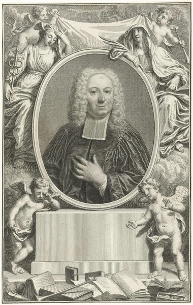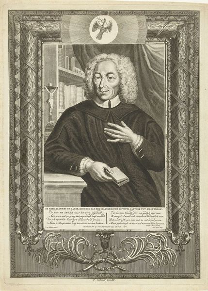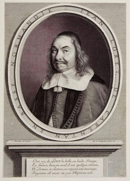 Curator: What an intriguing portrait. This engraving by Jacobus Harrewijn, dating back to around 1698, captures Petrus Stockmans, and it is currently held at the Rijksmuseum. The details in the face are really something! Editor: Immediately, I’m struck by its formal austerity. The rigid lines of the brickwork background versus the flowing script of the text circling Stockmans gives a kind of visual tension. And is that his coat of arms down below? There’s a calculated mood of sobriety, don’t you think? Curator: Absolutely. Thinking about the labor involved in creating such detailed engravings, we're seeing the process of meticulous reproduction, a technique often employed for disseminating information and projecting status in that era. The crispness of the lines, achieved through skilled cutting and printing, it is more than just aesthetics here. Editor: I agree, those repetitive crescent moon symbols in his heraldry speak volumes. Moons have ancient connections to cyclical change and perhaps speak to Stockmans’ own family history and the cyclical nature of power and influence. I can get lost in the semiotics here. Curator: I was just considering that coat of arms, in the context of this piece existing within a print culture, highlights access. Stockmans' role is as 'Consiliarius Regius,' translates to Royal Advisor - having an engraved portrait like this suggests an intentional propagation of an image representing governance. Think about its function in civic networks and distribution… Editor: And the hat, a subdued yet significant marker of his learned profession, frames his gaze with intention and gravitas. There is also the choice of rendering, Stockmans encircled in such deliberate terms invites the audience to interpret him not as a mere mortal but rather as a figure invested with deeper authority. Curator: I am sure this wasn't available to all members of society...This reminds me how visual media becomes an instrument for social climbing... Editor: Very good point! Ultimately, this isn't just a portrait of a man, but a visual condensation of historical memory, prestige and dynastic intention made enduring via symbolism. Curator: Yes. It really brings out questions of materiality and craft; each step involved adds layers of social meaning, right? Editor: Absolutely, together we unearthed how enduring such symbols can really be through close examination.
