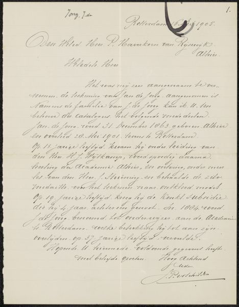 This letter to August Allebé was written by Carel Lodewijk Dake in 1915, with what appears to be a graphite pencil on paper. The looping and spidery quality of the marks reminds me of some of Cy Twombly's works. Dake’s handwriting is neat but not overly stylized, conveying a sense of urgency or intimacy, as if he wanted to get his thoughts down quickly. Look at the way he forms the letter ‘A’—it's almost a little drawing in itself! The pale grey color of the pencil against the off-white paper gives the whole piece a ghostly, ethereal feel. This letter feels like a little glimpse into the mind of the artist, a snapshot of a conversation between peers. It could be compared with the letters of Van Gogh to his brother Theo, or any of the wonderful written works of artists like Agnes Martin and Sol Lewitt. Ultimately, this piece reminds us that art is an ongoing exchange of ideas and inspiration.