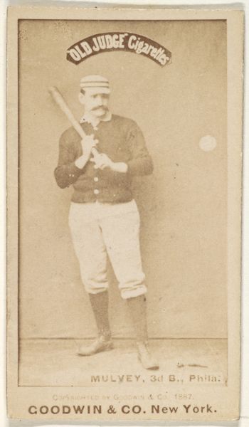 Editor: This is a baseball card from 1887 featuring Frederick "Fred" Herbert Carroll, a catcher for Pittsburg. It's a gelatin silver print, distributed by Goodwin & Company for Old Judge Cigarettes. I'm struck by the way it’s both a portrait of an athlete and also functions as advertisement. How do you see it? Curator: It's fascinating to consider this as an object embedded within a network of production and consumption. The card is not simply an image of an athlete, but a commodity itself, bundled with cigarettes and meant to be collected. It speaks to the rise of both mass media and celebrity culture, wouldn't you say? The means of producing and distributing this image - the photographic process, printing technology, and marketing strategies – become crucial elements of the artwork. Editor: Absolutely! The fact that this was a mass-produced item changes my understanding of its purpose and cultural value. Does the choice of gelatin silver print have a meaning? Curator: Indeed. Gelatin silver prints allowed for relatively inexpensive reproductions compared to earlier photographic methods, facilitating the mass dissemination crucial for advertising. Furthermore, consider the social context of labor. Who were the photographers, printers, and cigarette factory workers involved in creating this card, and what were their conditions of work? These cards are a product of complex socio-economic systems. Editor: That makes me think about the contrast between the celebrated athlete and the anonymous laborers whose work made this image possible. It’s much more layered now. Curator: Precisely. By examining the materials, processes, and social contexts, we reveal the hidden narratives embedded within the image itself. Editor: I see that! Thanks, I'll never look at these cards the same way again! Curator: Nor I. Considering it's value beyond a mere photograph really illuminates the broader cultural and economic forces at play.