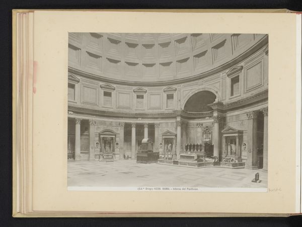 Editor: This gelatin-silver print, "Interieur van het Pantheon te Rome, Italië," attributed to Fratelli Alinari and dating between 1852 and 1900, really captures the vastness of the Pantheon. The geometric patterns are mesmerizing! What do you see in this piece? Curator: What strikes me is how this image engages with the then-burgeoning cultural fascination with antiquity and its relationship to modern Europe. This isn't just a depiction of architecture; it's a political statement. Consider the Pantheon's transformation: originally a Roman temple, then a Christian church. What does presenting it in this specific, almost sterile, way achieve? Editor: Almost sterile? It does seem very formal, now that you mention it. Almost…scientific. Curator: Precisely! Think about the rise of photography as a tool for documentation and how it's being used here. The Alinari brothers aren't just recording a space; they're presenting a carefully constructed image that implies objectivity and perhaps even the cultural authority of the photographer's gaze over history itself. How do you think the lack of human presence impacts our interpretation? Editor: It makes it feel even grander, like the space dwarfs us, reinforcing the power of the Roman Empire and the Church! Curator: Exactly! And in the absence of people, the architecture itself becomes the sole protagonist. This emphasizes the Pantheon as a site of power, subtly reminding the viewer of Italy's past glories, perhaps even advocating for its future resurgence. Editor: I never considered photography as a means of conveying a political agenda! Now, I see the building in a very different light! Curator: It's all about understanding the social and political context of its creation and reception! Photography isn't a neutral medium; it's a lens through which we view history, shaped by those who hold the camera.
