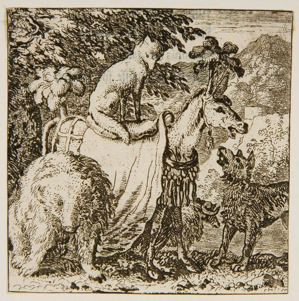 Curator: This is "Arcadian Shepherds," an etching by Moyses van Uyttenbroeck, a Dutch Golden Age artist who lived from 1590 to 1648. Editor: It's striking how the stark blacks and whites create a sense of intimate drama. The contrast almost feels confrontational despite the pastoral scene. Curator: Uyttenbroeck was known for these idyllic landscapes, often populated with figures from classical mythology or pastoral life. Consider the period and its wealthy merchant class. Editor: Right, this harkens back to simpler times. But for whom? The casual nudity and gazing livestock suggest themes of possession and male gaze even in a so-called utopia. Curator: I agree the composition has layered meanings. The figures appear detached, perhaps reflecting a disconnect between the wealthy patrons and the realities of rural life. Editor: And the scale—it's quite small, less than seven inches. This brings us face-to-face with uncomfortable questions about privilege, leisure, and our own historical position. Curator: Indeed, and by viewing it today, we can reflect on how art functions as both a mirror and a window into societal values across time. Editor: It's a reminder that even in idealized visions, power dynamics and social commentary are always present, prompting us to consider who benefits from this arcadia.