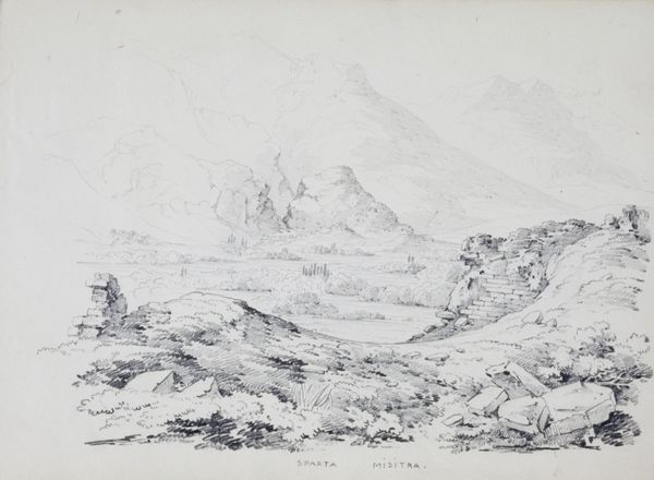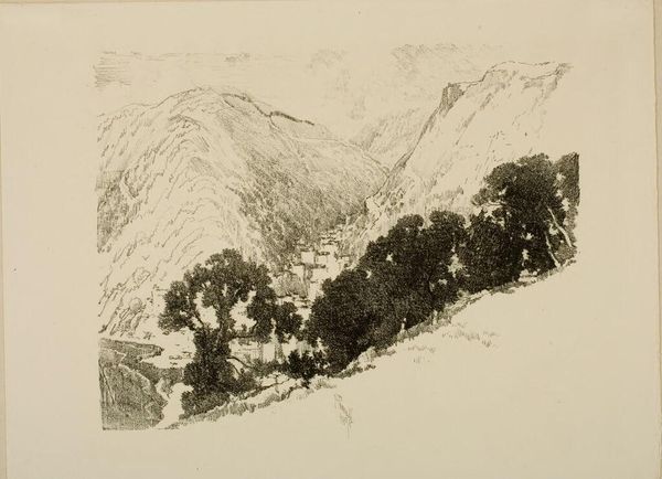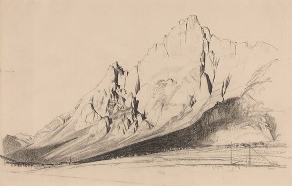 Curator: Ian Strang, who lived from 1886 to 1952, is the artist behind this work, "Craig-y-Bere," which is currently held in the Tate Collections. Editor: A landscape rendered with such meticulous detail; it evokes a profound sense of solitude and the timelessness of nature's monuments. Curator: The absence of human figures emphasizes the sublime power of the natural world, a recurring theme in landscape art of this period. It reflects broader social preoccupations with nature as a refuge. Editor: Exactly, and the mountain itself acts as a symbol. Its peaks, almost serrated, reach towards the heavens, carrying connotations of aspiration and challenge. The image may serve as a reflection of our own personal ambitions. Curator: Do you think the work reinforces the role of the landscape as an ideological battleground, projecting national identity and territorial claims? Editor: Perhaps. Though the scale and deliberate rendering push towards a more internalized, psychological space, I think. In the end, it allows the viewer to project. Curator: I hadn't considered that interpretation, but it does make me think about how landscapes can reflect our own internal states as much as external realities. Editor: Yes, and that's what makes this, and all works like it, endlessly compelling.