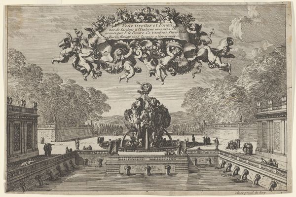 Jan Caspar Philips created this print, "Theater voor het Vuurwerk te Den Haag voor de Vrede van Aken, 1749," using etching techniques. The structure, with its careful symmetry and ordered repetition of architectural elements, immediately strikes the eye. The perspective draws us into a central vanishing point, emphasizing the ordered and staged nature of the scene. Philips employs line and form to convey a sense of rational, almost utopian space, constructed not for habitation but for spectacle. This relates to the broader Enlightenment ideals where reason and order were celebrated. The detailed etching allows Philips to play with light and shadow, enhancing the depth and texture of the architectural forms. Consider this artwork not just as a representation of a physical structure but as a symbolic space. The ephemeral nature of fireworks, combined with the solid geometry of the theater, presents a compelling commentary on the transient nature of peace and celebration. The print invites a dialogue between form and function, permanence and impermanence.