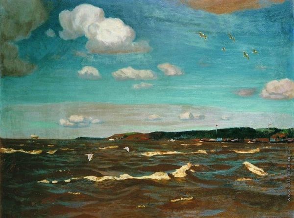 Arkady Rylov captured this brisk marine landscape using oil paints, a medium that has long been favored in fine art for its versatility and capacity for capturing light and atmosphere. Rylov applied the paint in visible strokes, creating a sense of movement and texture that mirrors the dynamism of the scene. Oil paint's viscosity allowed Rylov to build up layers of color, suggesting the depth and complexity of the natural world. The blend of pigments would have been a careful, laborious process, demanding skill and precision from the artist. Consider how the rough texture of the waves contrasts with the smoother, more blended sky, and how the heavy, opaque quality of the paint suggests the weight and power of the sea. By emphasizing the material qualities of oil paint, and the physical act of painting itself, Rylov invites us to appreciate "Fresh Breeze" not just as a representation of nature, but as a testament to the artist's labor and skill. This challenges the traditional divide between high art and craft, reminding us that all artistic creation involves a process of making.