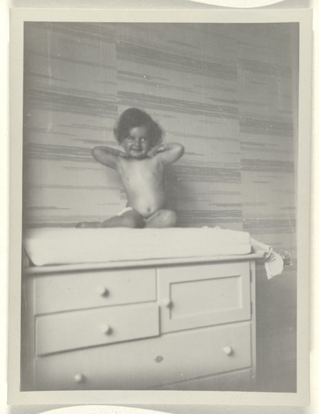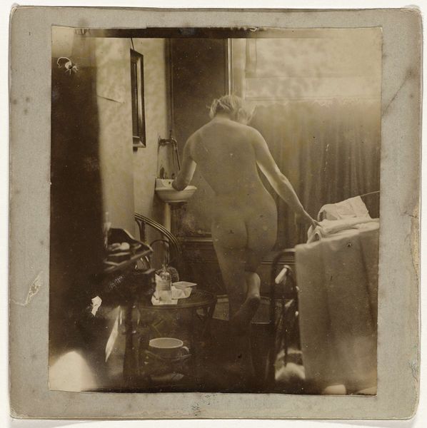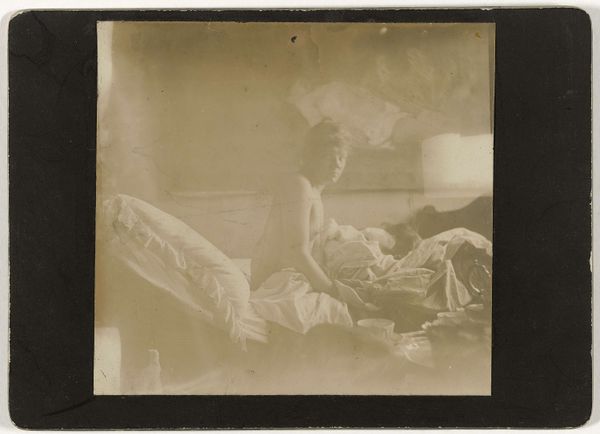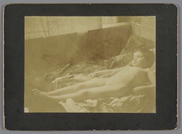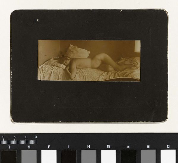 Editor: Here we have George Hendrik Breitner's "Marie Jordan naakt liggend op een bed," circa 1888, a photograph held in the Rijksmuseum collection. I am struck by its intimacy. It's like stepping into a private moment, yet the tonal range is quite narrow. What stands out to you in terms of its formal qualities? Curator: Note the framing, how it contributes to the image's tension. Breitner eschews a symmetrical, balanced composition, favouring instead an arrangement that pulls the eye toward the model. The off-centre placement, coupled with the tight cropping, enhances the sense of voyeurism and psychological density. Consider too the relationship between the subject's form and the flatness of the picture plane. Do you see how the shallow depth of field flattens the space, emphasizing the photograph’s inherent two-dimensionality? Editor: Yes, the composition definitely prevents a conventional reading of space! How might you relate the hanging drawings to that flatness? Curator: Those drawings disrupt any easy illusionism, functioning almost like abstract marks within the broader composition. Their ambiguity—are they preliminary sketches or discarded ideas?—compounds the sense of compositional layering. Semiotically, they might suggest the artist's hand, reminding us of the image’s constructed nature. But do these compositional choices alter your initial impressions? Editor: Initially, I was captivated by its intimacy, but now I see the composition is actively dismantling that. Curator: Precisely! We begin with a semblance of immediacy only to discover that the structure deliberately subverts easy access. The photographic medium lends itself to this interpretation. Editor: It seems my feelings about the piece have changed, so thanks for pointing out the different elements to analyze. Curator: It's through that critical engagement with form that meaning unfolds, always resisting simple closure.