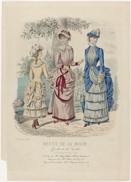 Curator: What a visually captivating image! This print from 1883, titled "Revue de la Mode, Gazette de la Famille" and credited to P. Deferneville, showcases a peek into late 19th-century fashion. Editor: Yes, immediately, I'm struck by the texture. All the frills, lace, and folds...it's such a feast of meticulously rendered detail, with that almost stippled application of color. The lines create a sort of optical dance, no? Curator: The fashion clearly dictates societal status and aspiration here. Note the prominent display of dresses—complex creations acting as signifiers of femininity and social identity in that era. Consider how these outfits, restricting movement and requiring assistance, would have influenced women's daily experiences and self-perception. Editor: Agreed. And thinking formally, each woman seems confined within her garment's geometry—the dresses become almost architectural. See how the artist employs color and pattern to compartmentalize space—the pink, blue and brown define separate realms in this plane. Even their poses feel regulated and static. Curator: Romanticism influences this piece. The backdrop evokes nostalgia for simpler times. These women might embody ideal grace and respectability of the period. Fashionable styles act as armor protecting from society while silently begging to be seen, doesn't it? It is social camouflage on display. Editor: Precisely. Look at how the mixed-media printing allows layering and superimposition—adding a quality to the overall artifice. We're witnessing a spectacle that's doubly staged. Are we looking at 'fashion' as a display of feminine social roles in the family of man—an idea that continues evolving and fragmenting today? Curator: Yes, images of fashion serve cultural memory. "Revue de la Mode" preserves ideas of elegance from that decade. Yet also provokes to consider where women stood inside their world during their representation as decoration. What did these styles communicate subconsciously at that moment, is a complex message to discern today. Editor: It is a lot to unpack in just one print. Seeing this now reveals more complexities between technique and social presentation than expected!