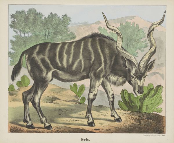Editor: This watercolor and ink drawing is titled "Connochaetes gnou (Black wildebeest)", created by Robert Jacob Gordon between 1777 and 1786. The animal is delicately rendered, yet something about the almost clinical precision makes me curious. What do you see in this piece, especially focusing on how the animal is presented within the landscape? Curator: Precisely. It's crucial to examine how Gordon uses line and wash to define form and texture. Observe the precise delineation of the wildebeest's musculature versus the comparatively loose application of watercolor in the landscape. There's a tension, wouldn't you agree, between scientific observation and aesthetic interpretation? The texture and the density of lines provide a sense of its presence. Editor: Yes, that tension is fascinating. It’s almost as if the wildebeest is isolated for study, despite the landscape setting. Do you think the rendering technique is different between the flora and the wildebeest? Curator: Indeed. The surrounding flora are suggested with quick, economical strokes, whereas the animal itself is depicted with painstaking detail. The contrasting textures invite scrutiny and consideration of the draughtmanship skill. How does this affect your perception of space and form within the image? Editor: I think the artist is saying that the landscape has texture in places and smooth plains elsewhere. If you are familiar with landscape this adds to its depth by using composition and drawing attention by shifting of color value. Curator: Precisely. One observes the subtle gradations of tone along the back of the wildebeest, achieved through careful layering of watercolor washes. These tonal variations aren't merely decorative, they delineate form and indicate the fall of light, thus constructing a believable three-dimensional space. Do you discern anything symbolic in the animal’s isolation? Editor: It really brings home how much can be understood just through form and composition and materiality. Curator: Precisely. The stark contrast showcases the aesthetic beauty of its individual features within this tableau.