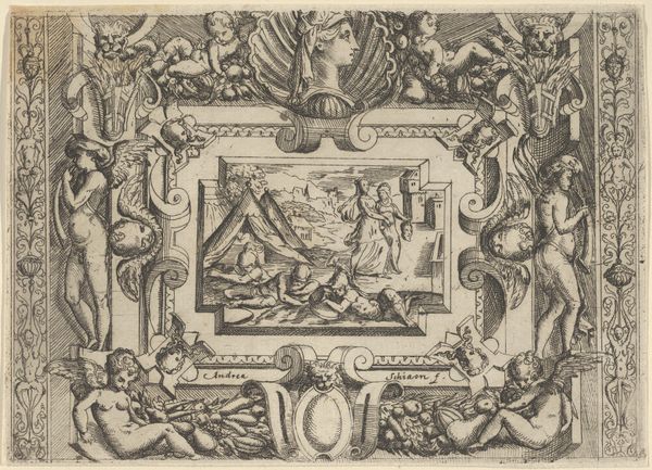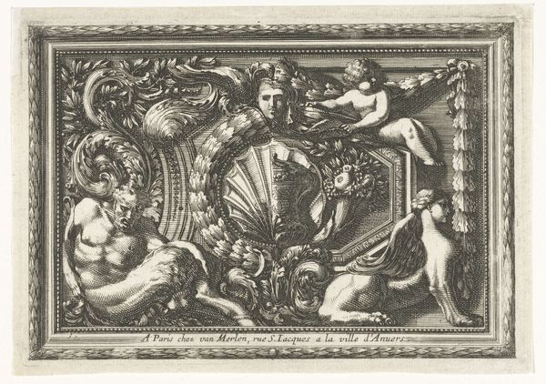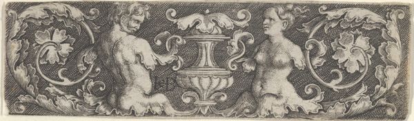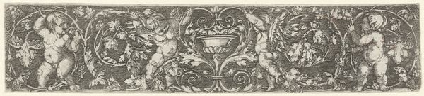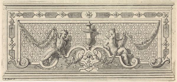 Curator: This ornamental frieze, etched in 1784 by Jean Jacques Lagrenée, displays a delicate dance of putti amidst acanthus leaves and floral garlands. It is a page lifted from "Recueil de Différentes Compositions Frises et Ornements," which you can find here at the Met. Editor: Oh, it's playful! But restrained, almost melancholic, with that sepia tone. It feels like cherubs are frozen mid-frolic, suspended in time. A ghostly echo of celebration. Curator: Indeed. Its academic style emphasizes controlled execution; even the cherubic frolicking serves a decorative function, speaking to the values of the late eighteenth century. Think ornamentation, interior design—these prints circulated widely, influencing craft production and artistic reproduction. Editor: Reproduction… that’s interesting, the artistic intention lies in the craft or the massification. The design flattens out into two dimensions but gives me a craving to see these forms inflated, brought to life with marble. Imagine that fountain actually spouting water! It also prompts me to question our obsession with capturing "playfulness" or childhood's innocence". Is there darkness in it as well? Curator: Dark chocolate, perhaps? What interests me, as always, are the processes involved. Engraving and printing allowed these Neoclassical ideals to reach a far broader audience than any singular marble sculpture ever could. Each leaf, each cherub carefully translated and disseminated, influencing tastes and design on an almost industrial scale. Editor: Agreed. This piece becomes so interesting as evidence of consumption habits. Now, knowing it was printed at a time when revolutionary ferments roiled France makes my senses ignite. Is this ornamentation is a fragile symbol? It makes one ponder. Curator: Precisely. Consider the conditions of artistic production—the access to workshops, the patronage systems...it speaks volumes about artistic agency. Editor: So it does! A faint, innocent yet strangely charged testament. It makes me think twice about decorative objects and the human conditions of labor around them. Curator: Thank you for lending your sensibility to this print. Now, let's move along and analyze the following work of art...