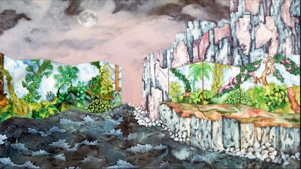 Abdul Mati Klarwein painted "Leh C'est Beau Aka. Landmark" using oil on canvas; its meticulous detail and dreamlike imagery create a captivating visual experience. The artwork features a landscape dominated by textured earth tones, punctuated by striking elements such as the fiery tree and distant structures. The composition employs a structured arrangement of forms: the lower register shows a stream with the reflection of the moon and a face, layered with a textural stone wall and vegetation. Above this, the painting presents a series of forms suggesting a landscape, with repeated elements and strong colours of earthy browns and reds. This repetition encourages a semiotic reading of the landscape as a coded system where each element carries symbolic weight. The tree with flames perhaps serves as a signifier of both destruction and purification. Overall, "Leh C'est Beau" destabilizes conventional landscape painting through its surreal and symbolic logic. It invites us to question the fixed meanings we attach to natural and architectural forms, thereby engaging in a broader dialogue about perception and representation.