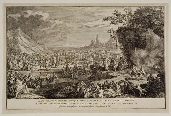 Curator: Before us hangs Adam van der Meulen's "Construction of the Château De Versailles," an oil painting dating back to 1669. Editor: My initial response is one of…organized chaos? The scene is bustling, gritty, and strangely beautiful in its depiction of immense labor. The color palette, dominated by earth tones, gives it a grounded, almost documentarian feel. Curator: Indeed. It presents a fascinating intersection of baroque grandeur and realism. Notice the structural elements—the verticality of the incomplete buildings drawing the eye upward, contrasted by the horizontal sprawl of activity. The composition is a clear attempt to demonstrate not just construction, but control. Editor: Precisely! And consider the sheer scale of the project reflected in the teeming figures. This isn't just a building; it's a display of power and the centralizing ambition of Louis XIV. Van der Meulen subtly underscores the social hierarchy with the finely dressed figures in the foreground overseeing the laborers. Curator: Observe, too, the deliberate placement of the scaffolding, acting almost as a framework for the image itself, mirroring the framework being erected in the physical construction. Note the artist's rendering of texture, particularly in the stone and the play of light on the rising walls. It gives a tangible presence. Editor: But there's a political narrative embedded in this texture as well. Think of Versailles, not just as a palace, but as a stage designed to awe both foreign dignitaries and the French nobility. This painting acts as an advertisement of sorts, displaying the absolute monarchy in action. It's a very strategic landscape. Curator: So the realism serves to emphasize the logistics and scope of royal power, doesn't it? A powerful display. The meticulous application of oil paint emphasizes the sense of immense tangible endeavor and organization behind this national treasure under construction. Editor: Yes, by viewing it through the lenses of material, power, and design, the image truly shows Versailles is more than the sum of its stones. Curator: Reflecting on the structured landscape presented in "Construction of the Château De Versailles," I find an enriching view of an attempt at control and organization. Editor: From my point of view, it reflects the social and political ambitions intertwined to materialize architectural might as a strategic power narrative.