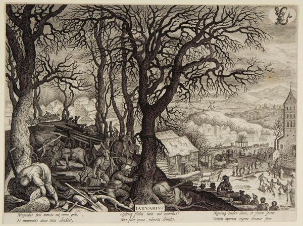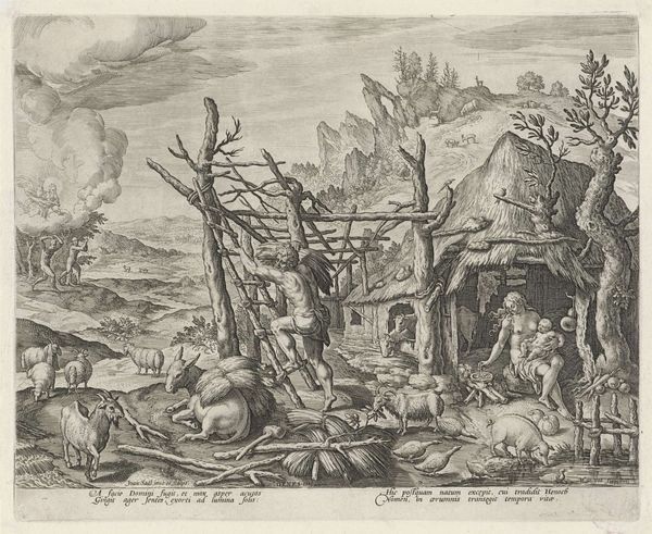 Curator: This is Johann Sadeler's "Cain at Labor," currently held in the Harvard Art Museums. It depicts a biblical scene, rendered in meticulous detail. Editor: It strikes me as an illustration of the heavy toll of everyday life. Look at the contrast between Cain struggling with the framework and the relative tranquility of the family scene. Curator: Sadeler, working in the late 16th century, presents labor not just as physical exertion but also as a social and material condition. Consider the construction of the hut—what kind of labor went into sourcing and assembling those materials? Editor: Exactly. And think about the historical context: the rise of mercantile economies, the changing social roles. Is this a commentary on emerging class structures, using a biblical allegory? Curator: Perhaps. It's about the intersection of making and living. The tools, the shelter, the family: these are all physical manifestations of their existence, shaped by their labor. Editor: It certainly gives us a glimpse into a world where the act of building a home is fraught with meaning, beyond simple shelter.