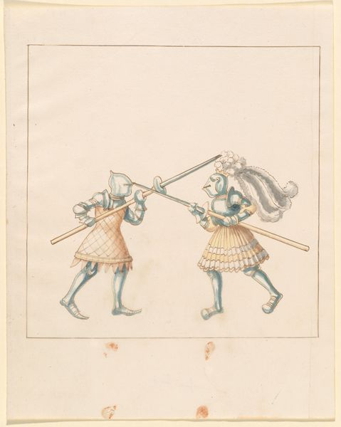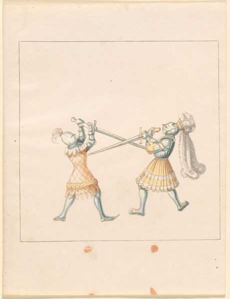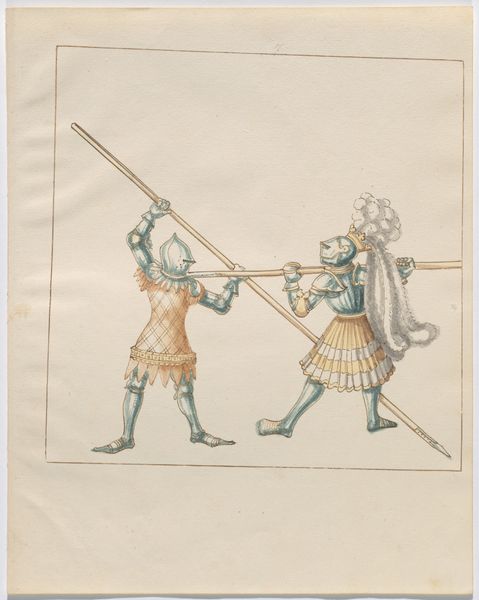 This drawing of foot combat with awl pikes was made by an anonymous artist using ink and watercolor on paper. These are the traditional materials of manuscript illumination, and the paper support also suggests a close relationship with the culture of the book. Yet the image also offers us insight into the production of armor. Consider, for example, the way in which the light plays on the rounded surfaces of the helmets and breastplates. This would have been achieved by repeatedly hammering the metal over a shaped form. In a society where skill at arms was paramount, armor-making was an industry of great importance, and the drawing allows us to see how the techniques of rendering metal armor were closely tied to the act of production. Drawings such as this remind us that the world of the illuminated manuscript was not separate from, but deeply implicated in, the material culture of its time.