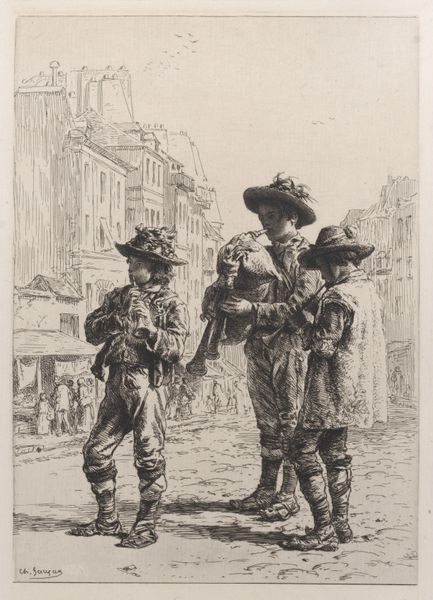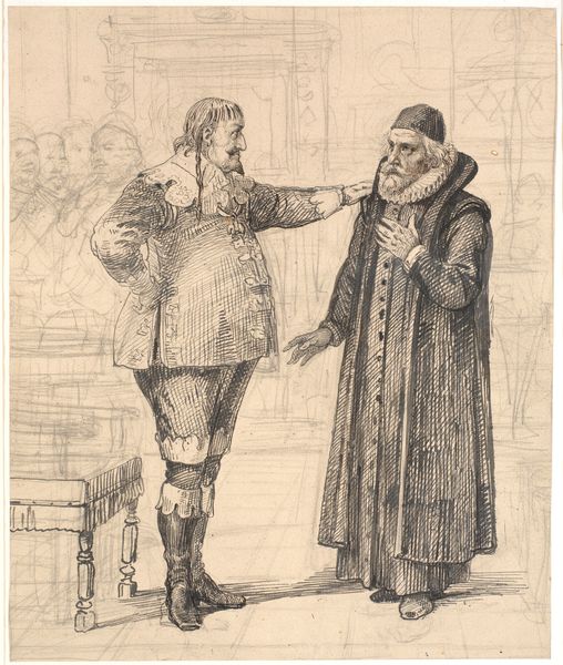 Wilhelm Marstrand created this drawing, Jean de France, I, 1., using pen and brown ink. The composition is dominated by two figures in the foreground, meticulously detailed with fine lines that capture their elaborate attire and animated expressions. This precision contrasts with the more loosely sketched background, creating a visual hierarchy that draws our attention to the interaction between the two men. Marstrand’s strategic use of line and form establishes a clear semiotic structure. The characters' clothing and posture signify social status and demeanor, inviting viewers to decode the underlying social dynamics. The detailed rendering of the foreground figures juxtaposed against the sketched background challenges traditional notions of depth and focus. This formal arrangement suggests a deliberate destabilization of established pictorial conventions, prompting a re-evaluation of narrative and representation. The unfinished quality of the background further emphasizes the provisional nature of meaning. By leaving elements incomplete, Marstrand acknowledges that art is not a fixed entity but a dynamic process of interpretation.