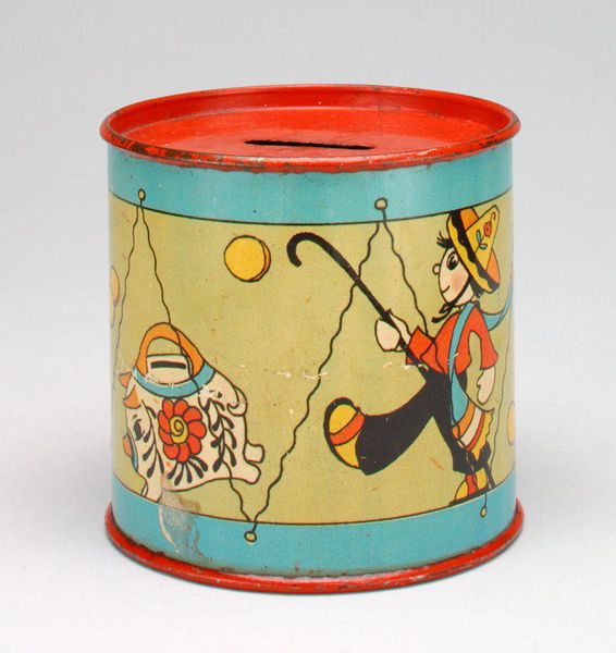 Editor: This sweet object is titled '-Flower Basket- still bank' dating from the early 20th century, currently held at the Minneapolis Institute of Art. It’s made of metal, pigment and paper. I am struck by the tension between the delicate floral imagery and the hard metal of the basket; what do you make of this curious combination? Curator: It's fascinating, isn't it? Think of the flower basket itself as a symbol. Historically, and even psychologically, a basket brimming with blooms represents abundance, prosperity, and the fruits of one's labor. Now, place that symbolism within the context of a still bank, a repository for savings. The bank is both container and protector of future capital. Do you see now how these signs point toward values cherished in the early 20th-century United States: growth and security? Editor: Absolutely! The flowers as a promise of future gains, almost like an investment blooming into wealth. I also notice the repetitive, almost industrial design of the metalwork. It feels very mass-produced. Curator: Exactly. And that's where it gets interesting. The decorative arts often reflect broader societal trends. Here we see mass production combined with hand-applied illustrative details. The object speaks volumes about early American consumerism and industrial values striving to associate itself with the natural, the safe, and the beautiful. Does the domestic space not become itself an emotional space, too? Editor: That really opens it up for me. I thought it was just a cute bank, but seeing it as a cultural object really deepens its meaning. Curator: Indeed. It’s through these layered symbols that we engage more deeply with a past society's ambitions. What seems simple is very often richly textured with shared histories and human desires.