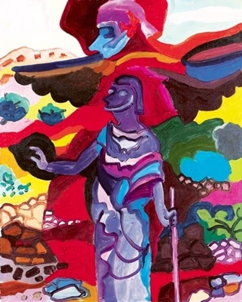 David Chethlahe Paladin's "St. Francis" is a flat, decorative devotional image, where the mark-making feels intuitive, maybe even childlike. The animals and saint are outlined with clear, hard edges, filled in with opaque colors. There’s not a lot of blending. It's honest, and what you see is what you get, like a drawing made with crayons. The texture is smooth, and the paint seems thinly applied, which allows the surface of the support to remain visible. The various animals are treated with similar consideration, each one distinct yet unified in their simplicity. I am drawn to the deer with the spotty body and big surprised eyes. This directness reminds me a little of Henri Rousseau, another artist who embraced a self-taught aesthetic, and it's a reminder that painting doesn’t have to be complicated to be profound. It invites us to consider the beauty in simplicity and the power of faith and art to connect us to something larger than ourselves.