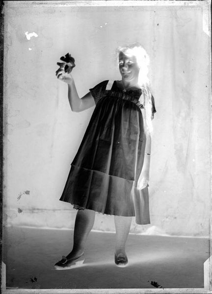 Editor: This haunting photograph, titled "Untitled (young girl wearing white dress and veil)" by Lucian and Mary Brown, has such a surreal quality due to the inversion of light. What strikes you most about its composition? Curator: The photographic negative presents a compelling study in contrasts and tonal range. Note how the inverted values disrupt our conventional understanding of light and shadow, creating a visual tension that is heightened by the figure's central placement. Editor: It’s like seeing a ghost. I also observe a very shallow depth of field, further emphasizing the figure against the blurred background. Curator: Precisely. The lack of sharp detail in the background pushes the figure forward and forces us to examine the material qualities of the dress and veil. A fascinating piece. Editor: I agree; I found the technical approach really interesting.