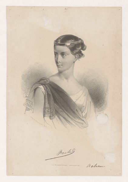 Editor: Here we have a portrait of Maria Adriana van der Pot van Groeneveld, created between 1823 and 1863 by Pieter Gerardus Bernhard. It seems to be an engraving or drawing, perhaps using graphite, and it has a really delicate quality. What do you see when you look at this piece? Curator: I see a fascinating record of material culture. The texture of the dress, the plumes in the hat – these elements speak volumes about the access to raw materials and the labor involved in producing such finery during this era. It's not just a pretty picture; it's a document of production and consumption. Consider also the printmaking process itself, an inherently reproductive technology making this likeness available beyond a wealthy patron. Editor: That’s a good point! It is a print, meant for wider distribution. The detailed rendering of the dress… Was the artistic value placed more on realistic representation or on the materials displayed in that era? Curator: I think it was both. Neoclassicism, with its emphasis on clean lines and realistic depiction, was a style favoured by the elite. The very act of rendering textiles and jewels with such care elevates the value of these items and by extension, the sitter's status. The means of artistic production mirrors the broader societal focus on acquiring and showcasing possessions. Editor: It's interesting to think about the image as a product of its time, reflecting social and economic realities through its very creation. Curator: Exactly. By considering the materiality and production process, we can start to unravel the complex relationships between art, labour, and consumption in 19th-century society. Editor: I never considered all the different steps involved to create the image itself as also part of the story. Curator: Indeed, every element from the paper to the ink tells a story. We see the labour in both artistic rendition as well as its effect in further reinforcing social stratifications.