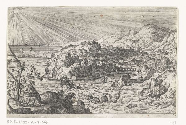 Editor: This is "Kuperet kystlandskab med orientalske bygninger" by H. Rosenkilde, created in 1746. It's an etching, I think? The overall mood feels... nostalgic, almost like a memory. What catches your eye? Curator: The depiction of "orientalske bygninger," which translates to "hilly coastal landscape with oriental buildings," immediately suggests a layering of cultural projections. Rosenkilde, though Danish, evokes a scene from the 'Orient' – but what did that signify to an 18th-century European audience? Consider the symbolic weight of that word alone, saturated with European fantasies and imperial ambitions. Editor: So, the "Orient" isn't necessarily about geographical accuracy? Curator: Precisely. Notice how the artist juxtaposes classical architectural elements, maybe from his European visual library, with the generalized forms representing 'Eastern' structures. This imagined Orient reflects Europe's perception of itself, relying on constructed visual contrasts. How do the figures in the foreground contribute to this? Editor: They seem like observers, almost like stand-ins for the viewer. As if we are positioned within that same historical European gaze, admiring something…foreign. Curator: Yes, we are implicated in the artist's act of seeing and interpreting. This wasn't just a neutral recording of a place; it’s about constructing and mediating cultural ideas, turning geography into a canvas for imagination. Editor: I didn't think about it that way before – it's not just a pretty picture, but a window into how cultures perceive each other, and themselves. Curator: Exactly. Visual representation serves as a mirror and a prism, reflecting both the subject and the observer, all at once. The “Orient,” as portrayed, then speaks more profoundly of Europe's aspirations and limitations.