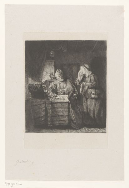 This etching by Edgard Farasyn depicts a child with a basket at a counter, with a woman behind it. Farasyn, born in Antwerp, Belgium in 1858, situated his work in the social realism movement. The image offers a glimpse into the lives of working-class women and children in the late 19th century. The girl, who is dressed in simple clothing, stands before the viewer, engaging with the viewer through her gaze. Meanwhile, the woman behind the counter seems preoccupied, perhaps weighed down by the burdens of her labor and social position. There is a tenderness that comes through in the way Farasyn positions the girl slightly in front of the counter, as if she is the future. The artist seems to capture a fleeting, intimate moment between two generations. The artwork serves as a poignant commentary on the experiences of women and children in a rapidly changing society, while hinting at both the hardships and hopes for a better future.